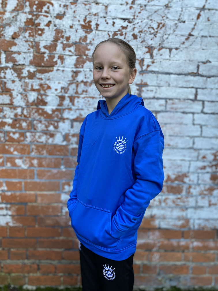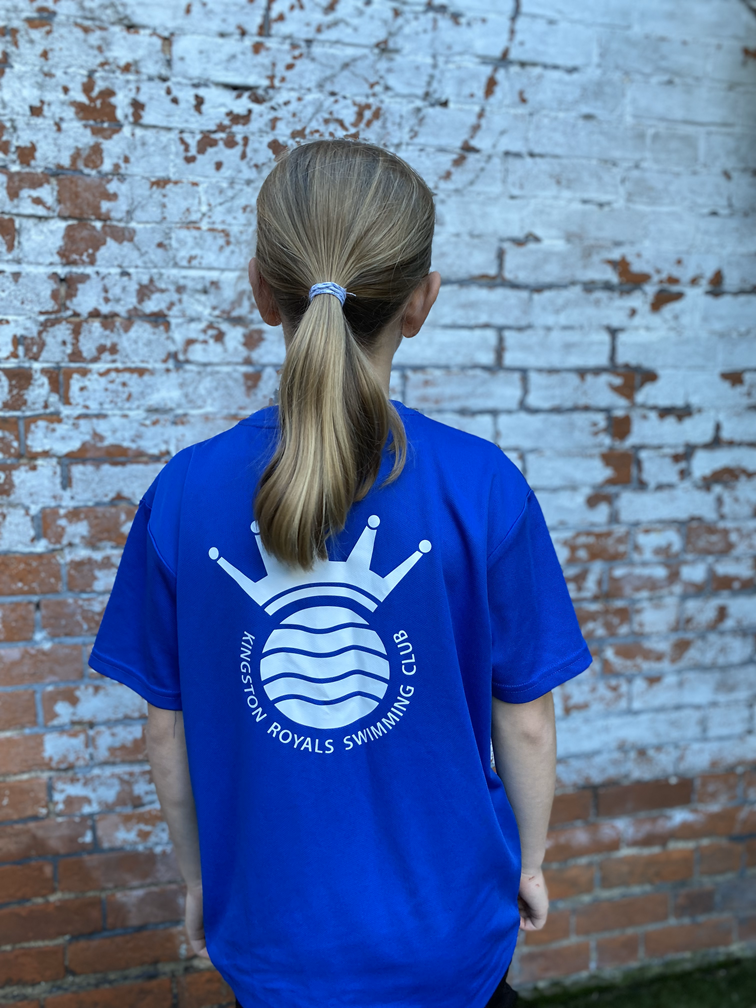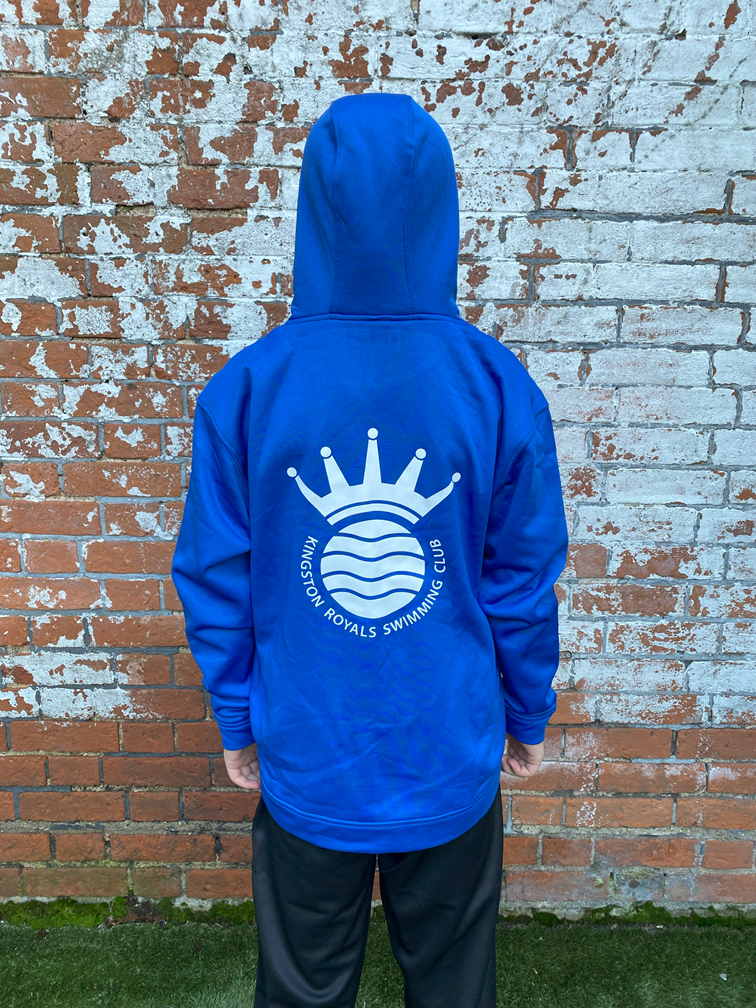 KRSC kit is available to all Kingston Royals Squad swimmers. We have a royal blue poolside tech t-shirt, hoodie, zip up long sleeve top, black bottoms and shorts. They are all embroidered or heat pressed with the KRSC logo on the left breast and the tops have a large logo on the back as well. There is an option to have initials added for an additional cost. Some photos of our kit are shown below.