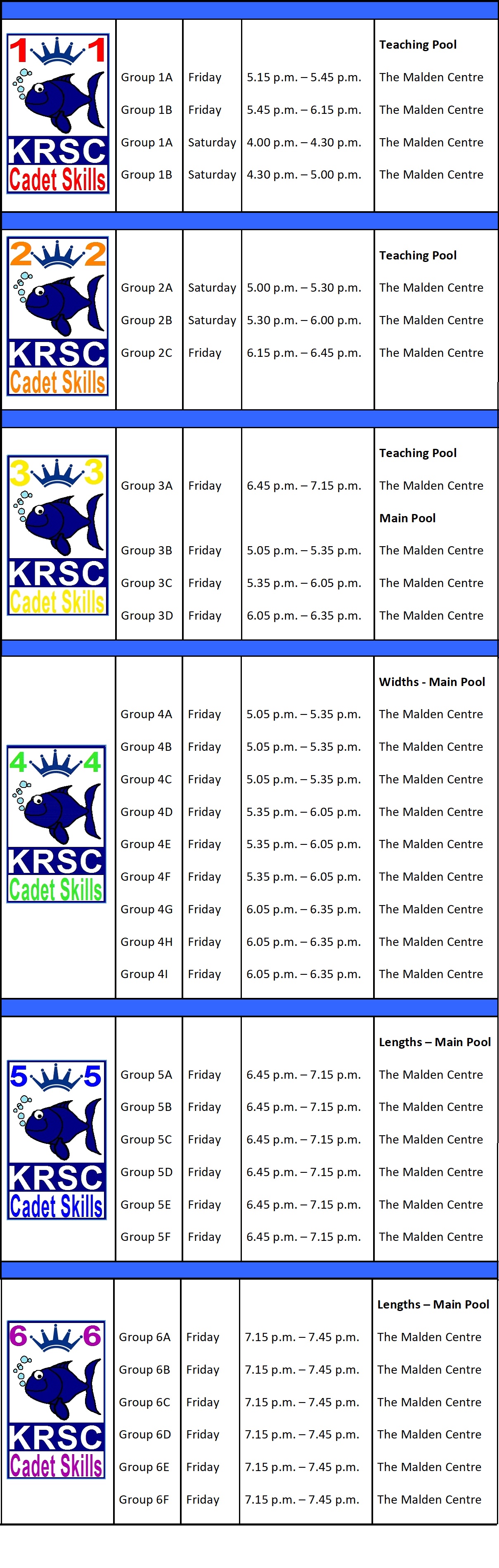 Cadet Learn to Swim Timetable