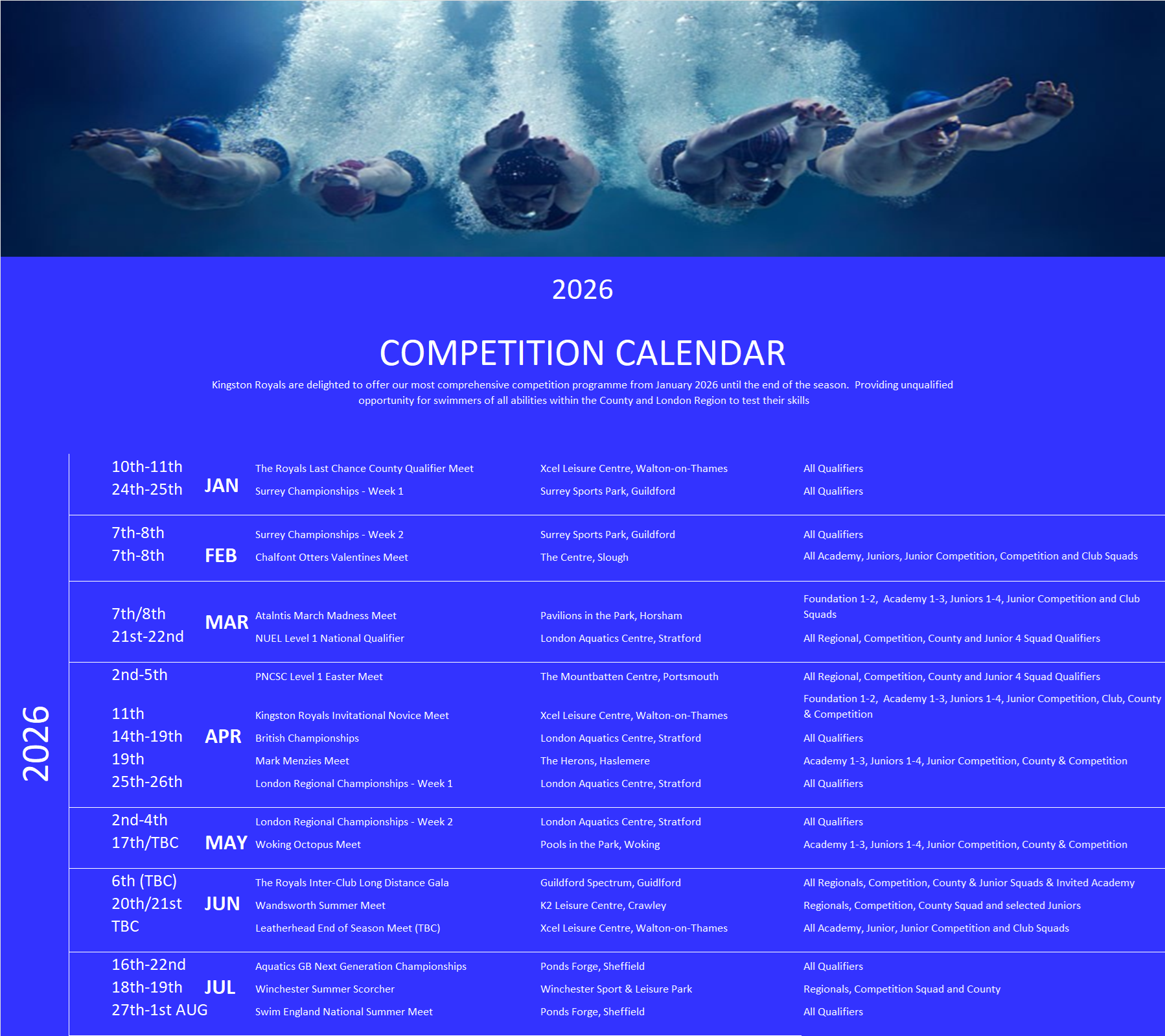 A printable version of the KRSC Calendar from January 2026 until the end of the season (August 2026) can be accessed here. Whilst every effort has been made to make this calendar as definitive as possible, please note this calendar could be subject to change. TBC next to any meet name on the calendar below means the date for that meet has not been definitively confirmed.
