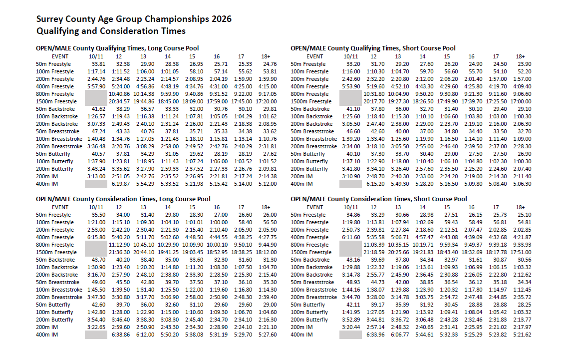 The Surrey County Championships are open to qualifying swimmers aged 11 and over (with 10 year olds being able to compete provided they meet the 11 year old Qualifying Times).