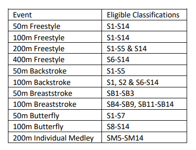 4. There are no Qualifying Times/Consideration Times for para swimmers. They can enter the following events using the criteria set out in points 1-3 above.